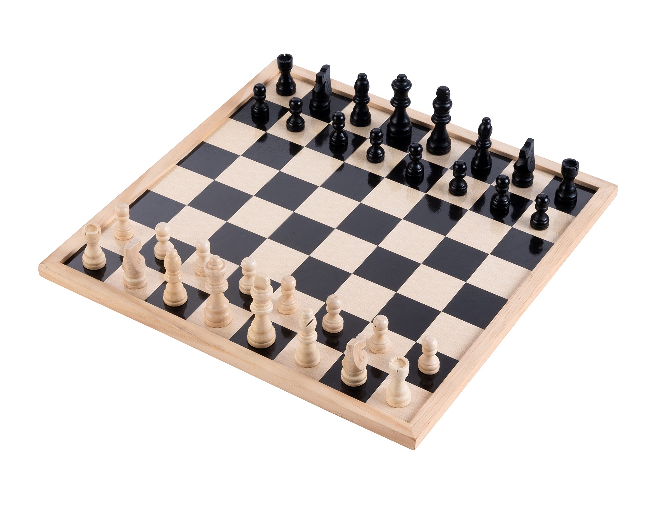 Er is een houten kistje met 32 schaakstukken. De koning heeft een hoogte van 77 mm. €9,95