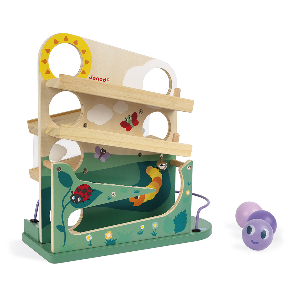 De 3 ballen gaan door de zon en de wolken, vervolgens door de transparante tunnel, laten de klok luiden en gaan vervolgens in de tuin en vormen een rups.